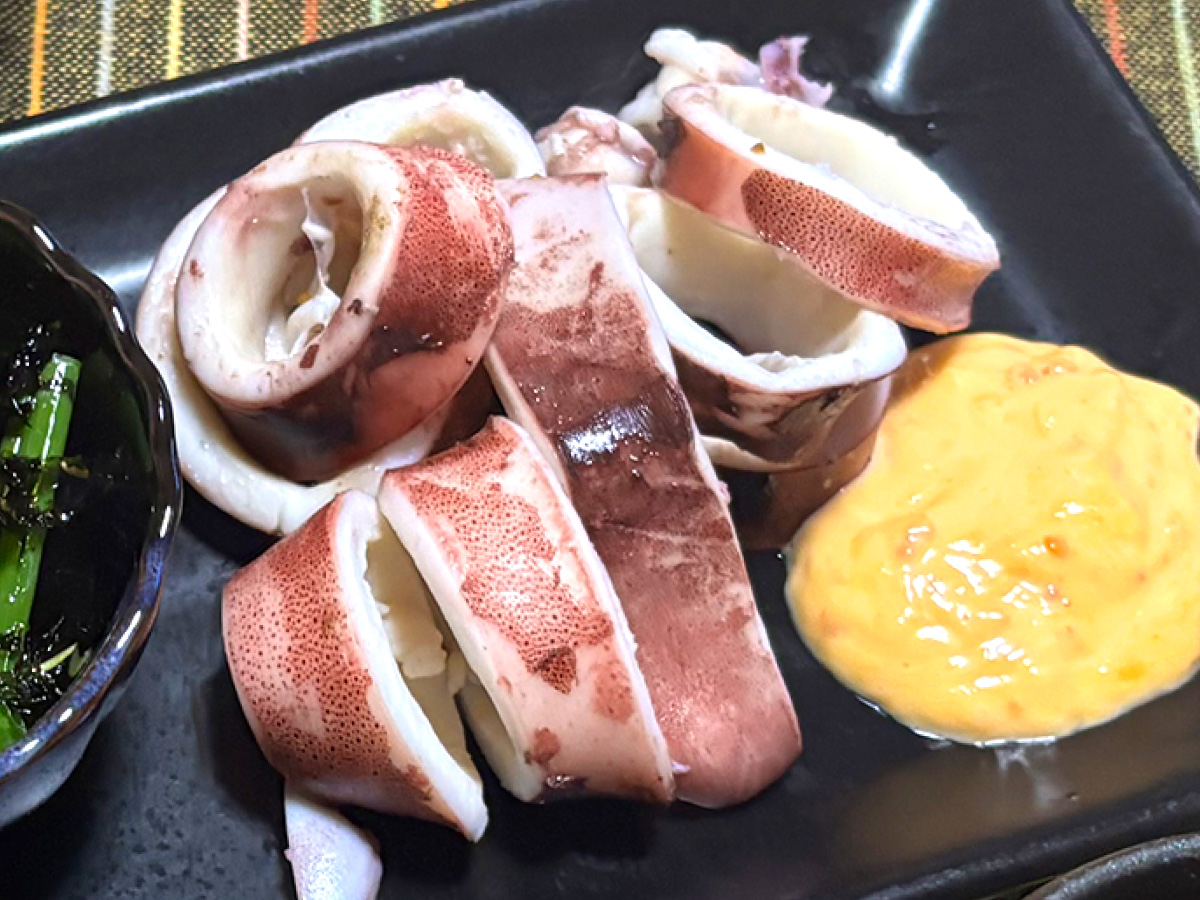 酒の肴には、旬のイカを茹でてシンプルに。スーパーでよく見かけるようになったので、二はい購入してそのままおつまみに仕立てました。丸ごと買ったので、ゲソやミミ、トンビ(くちばし)まで余すことなく味わえます。茹でたて熱々は、ほんのり塩気だけでも十分でしたが、かんずりを加えたマヨネーズを添えると、辛味と香りが広がり、また格別でした。