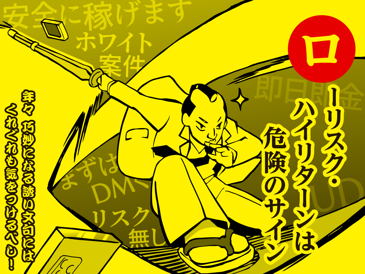 「日給30,000円」「報酬5万円」など一般的な仕事に比べて不自然に高額な報酬が提示されている場合には注意が必要です。また、「即日払い」「お金配りますよ」など即日に給与や報酬が支払われることを強調している文言も危険なサインです。