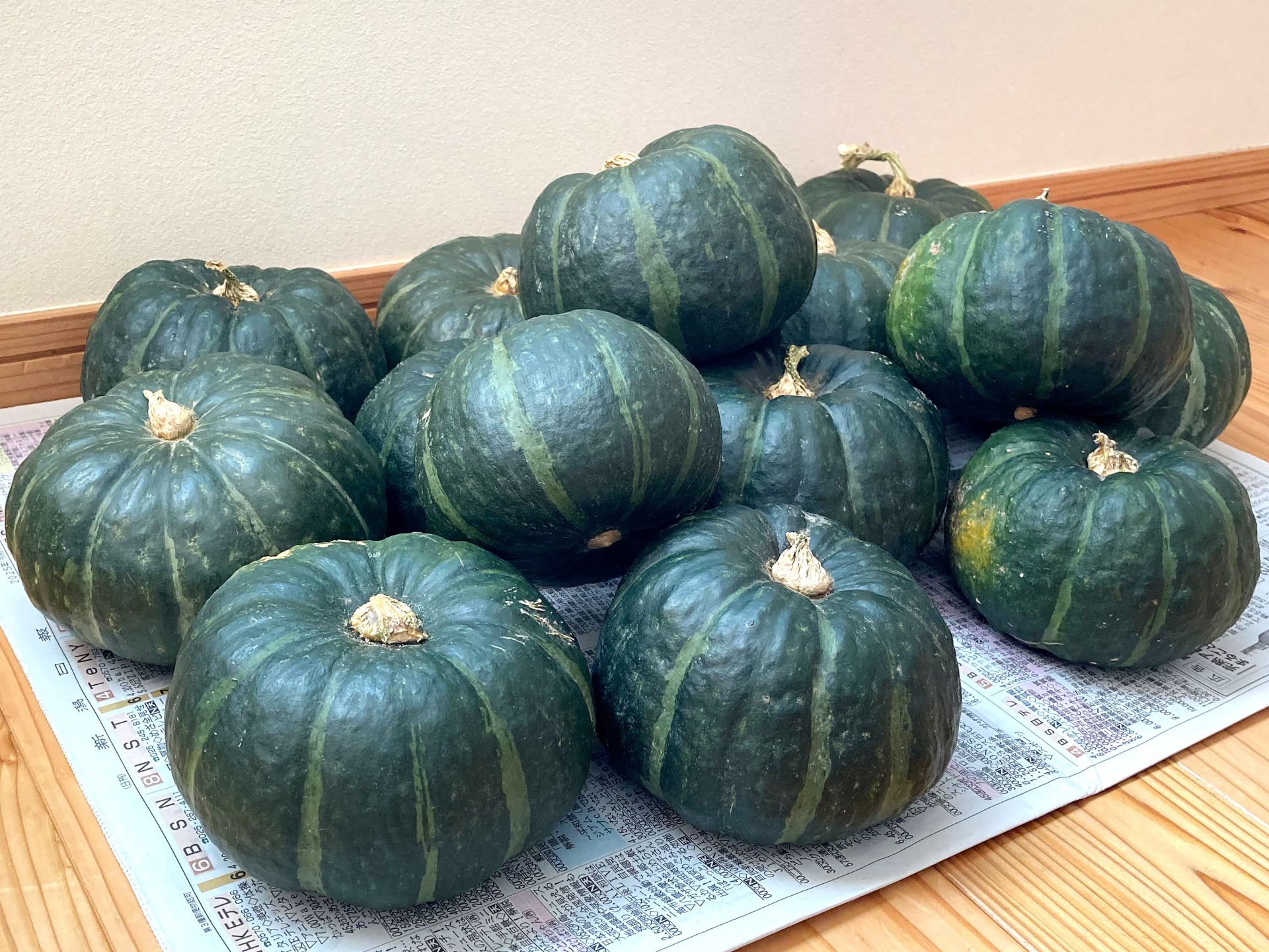 小さな畑いっぱいに茂った蔓と葉の下のあちこちにかぼちゃがゴロゴロ。あっあんなところにもある……というわけで1本の苗から20個以上を収穫しました。