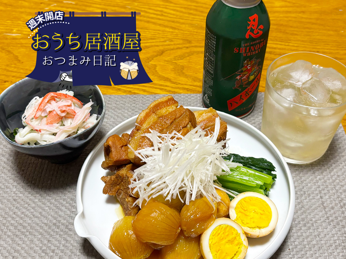 そしてお土産のハイボールは、甘さ控えめのキリッとした味わい。濃いめの角煮と相性抜群! トロトロの小玉ねぎ、やわらかな豚肉のこってり感、そしてシャキシャキのサラダ。その対照的な食感や風味を、ハイボールで流し込む……とても幸せな晩酌のひとときになりました。