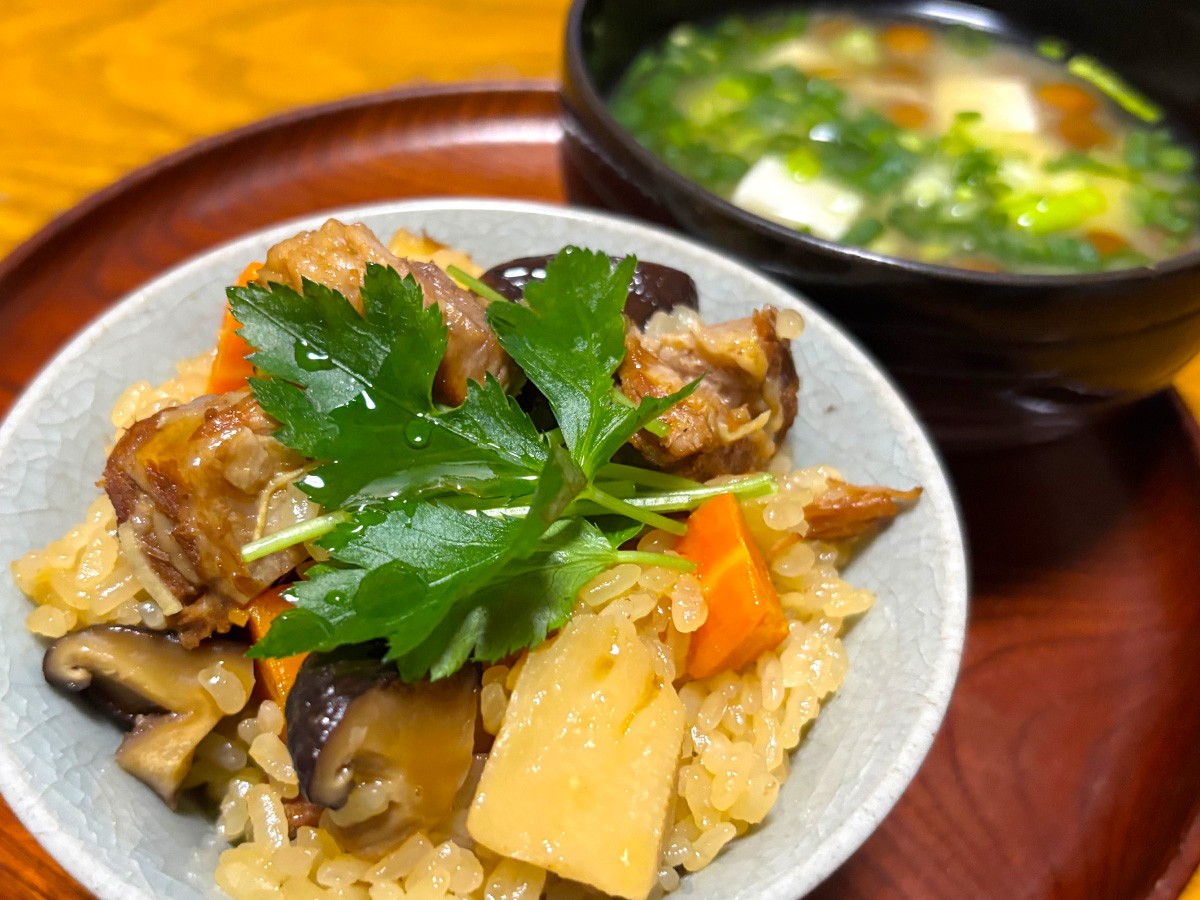 翌日、残った角煮(実はたっぷり作って、あえて残しました)を煮汁ごと中華おこわにリメイク。仕上げにゴマ油をちょこっと垂らして、香りと風味をアップしました。