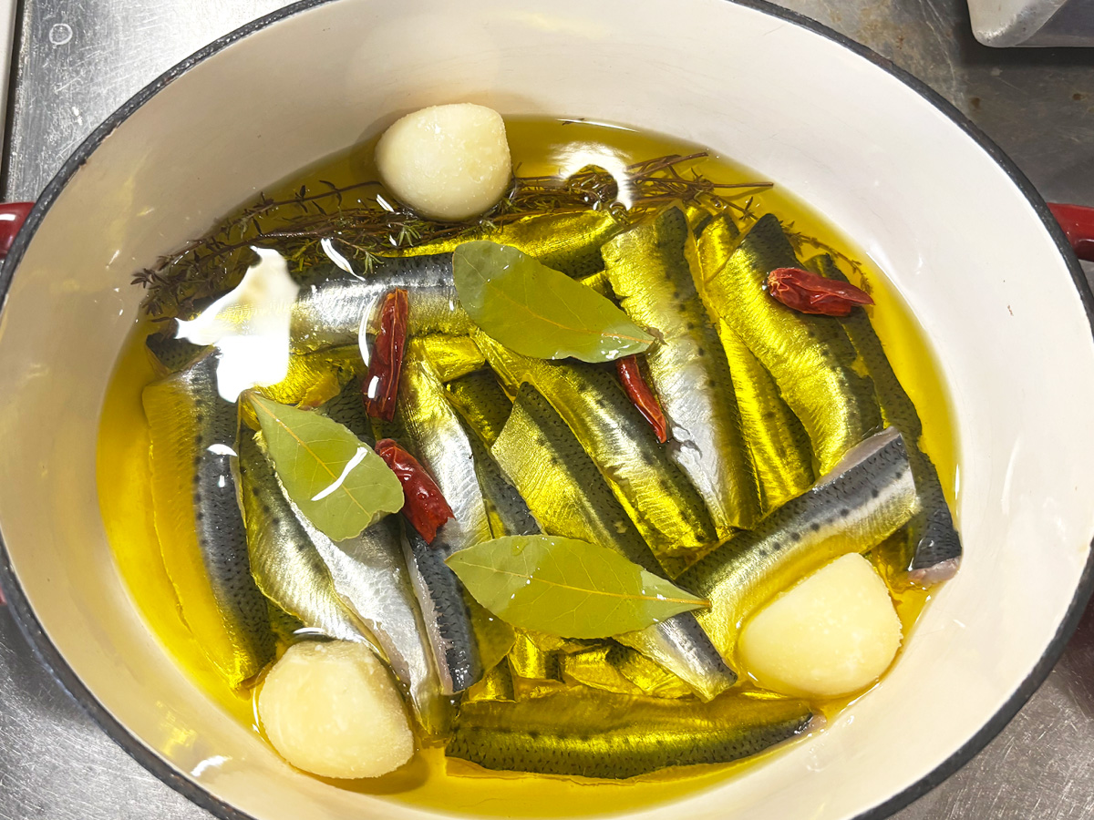 水気をよく拭き取ったイワシをお鍋に入れ、たっぷりのオリーブオイルとニンニク、鷹の爪、粒コショウ、ハーブを加えてコトコトと煮込みます。