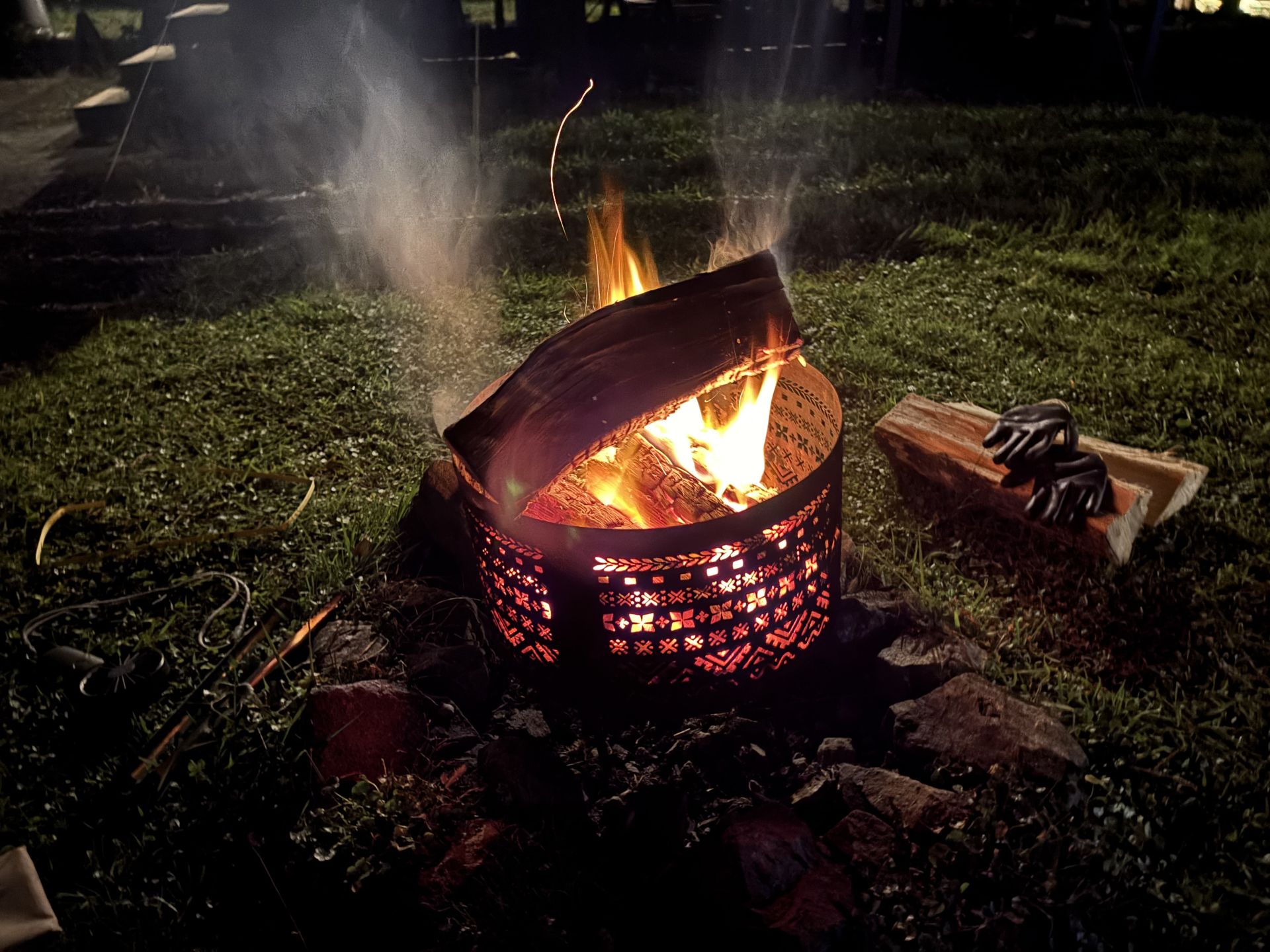準備から後片付けまで友人の旦那さんにおまかせで、私は着火のお手伝いぐらいでしたが、夕暮れとともに薪が燃え、火がだんだん明るさを増していきました。