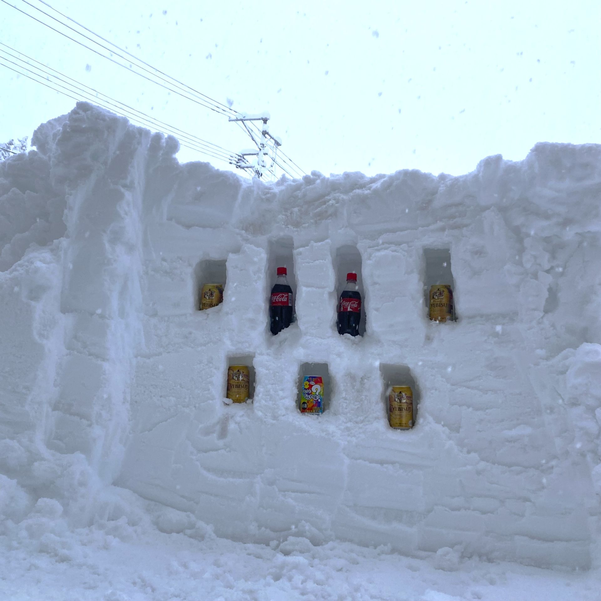 大雪のある日、除雪でできた雪山を前に、筋トレも兼ねて子どもと一緒に遊んでみることにしました。スコップで雪を削り、穴をあけてジュースやビールを差し込む「雪山ドリンクスタンド」です。