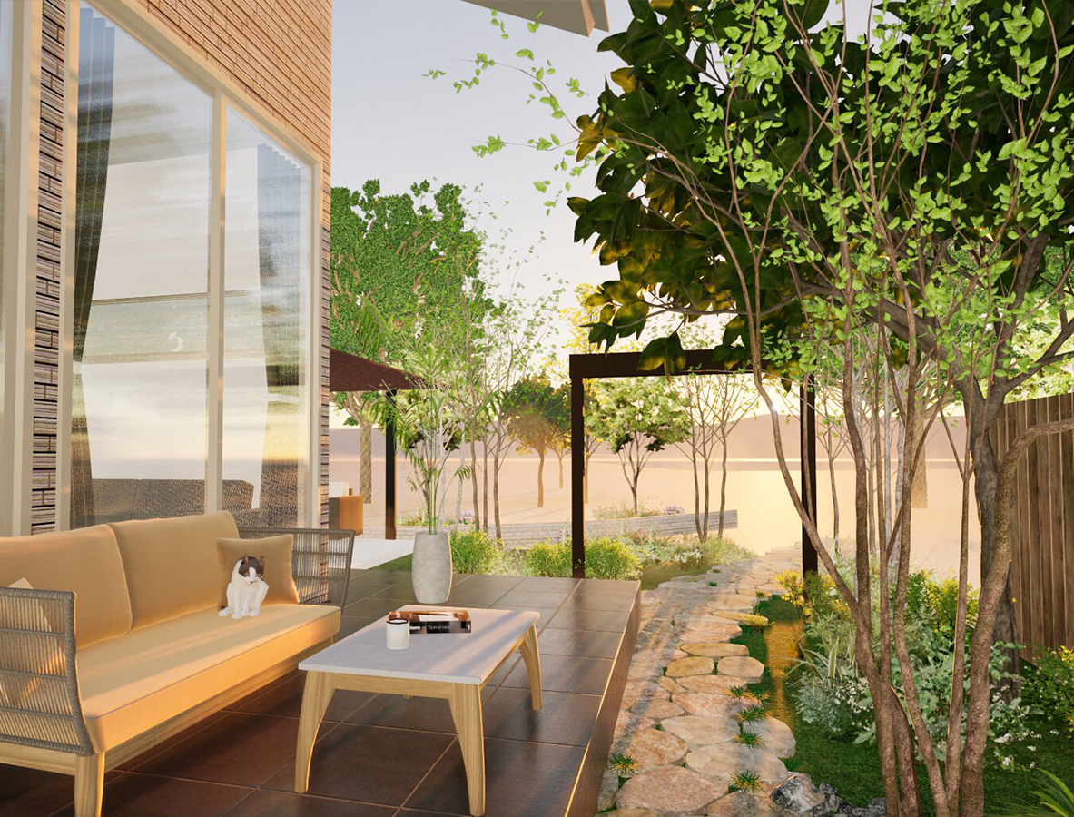 デザインはもちろん、植栽の配置、照明の演出、全体のバランスなどを立体的に確認できるようパソコンで3Dパースを作成。完成イメージを共有できるよう心がけています。